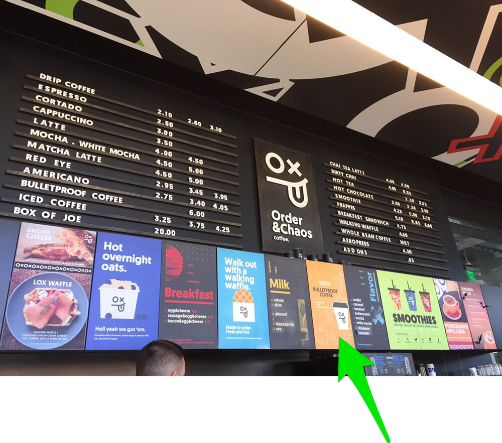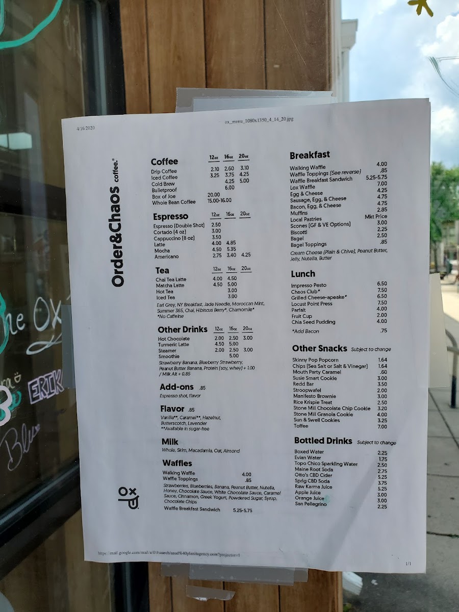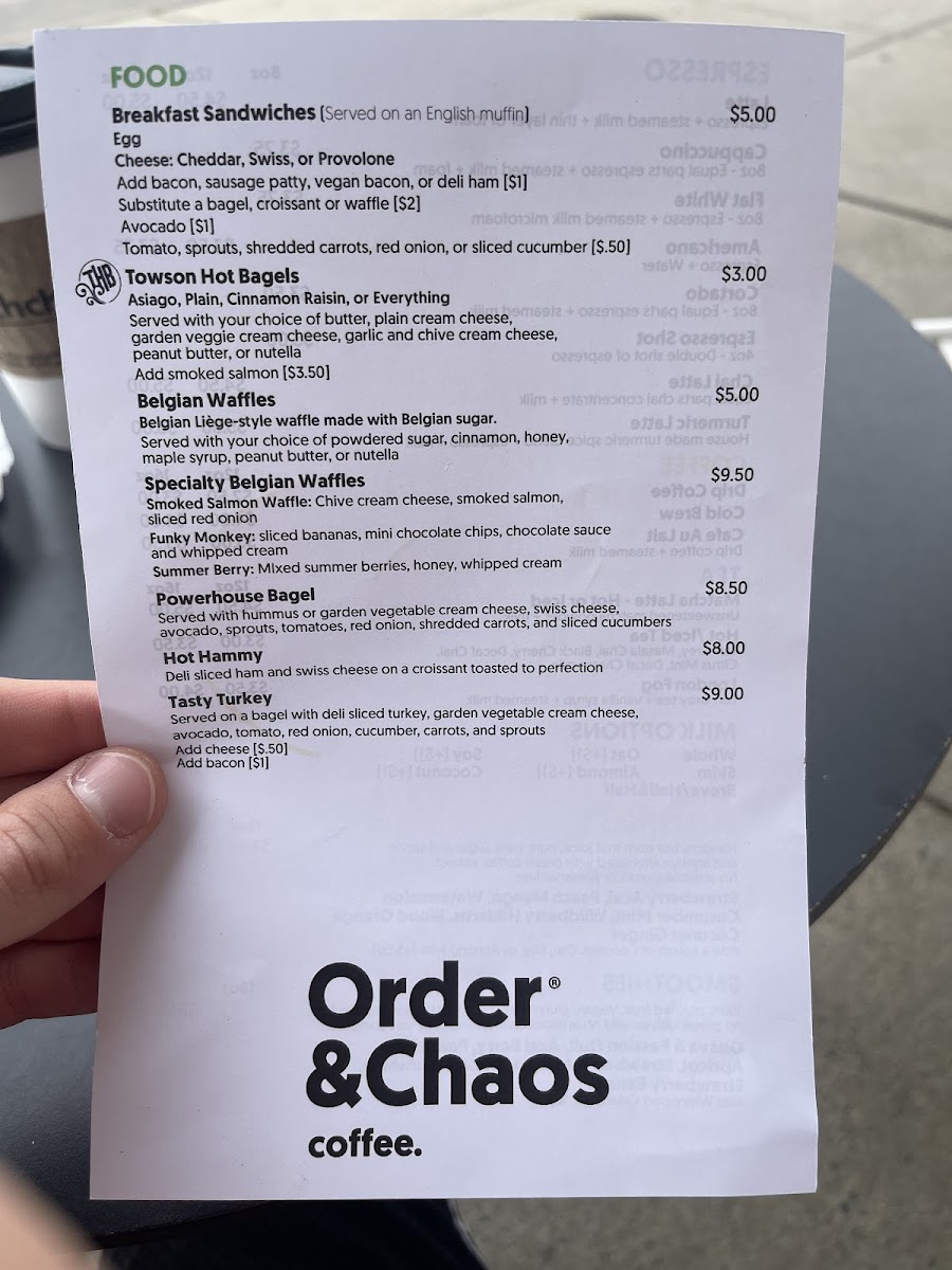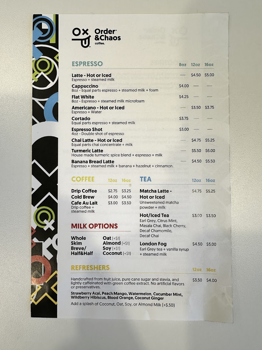The menu at Order & Chaos Coffee offers a selection of coffee drinks, other beverages, and light food options suitable for breakfast, coffee breaks, or light meals. The menu is organized into several categories to help visitors navigate their choices easily.