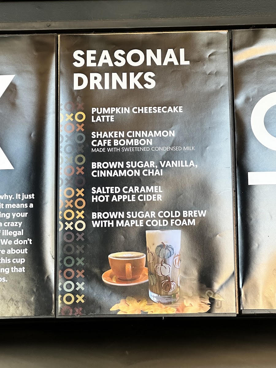 Food items include breakfast sandwiches, croissants, and specialty items such as the Lox Waffle. These choices are designed for quick, casual dining and pair well with the beverage selections.